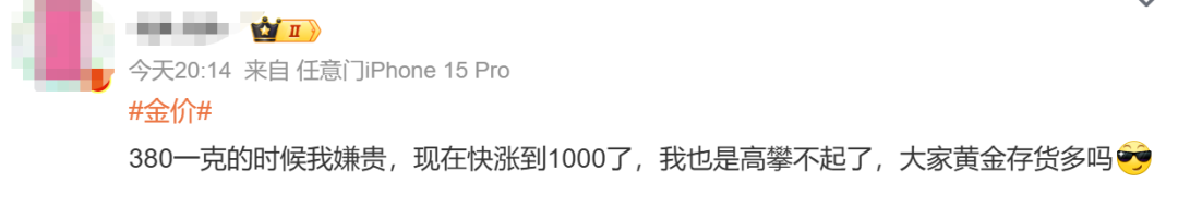 有網(wǎng)友稱(chēng),“現(xiàn)在的金價(jià)已經(jīng)超出理解的范圍了 ?!?/p>