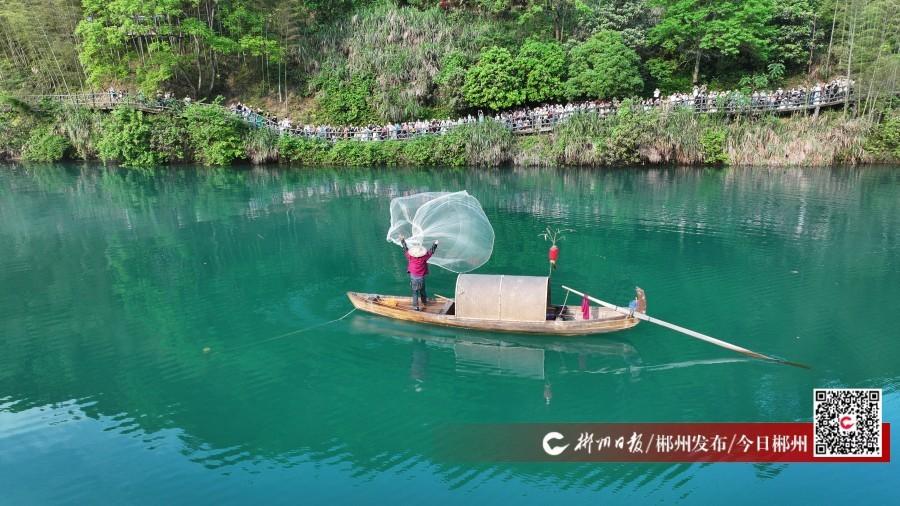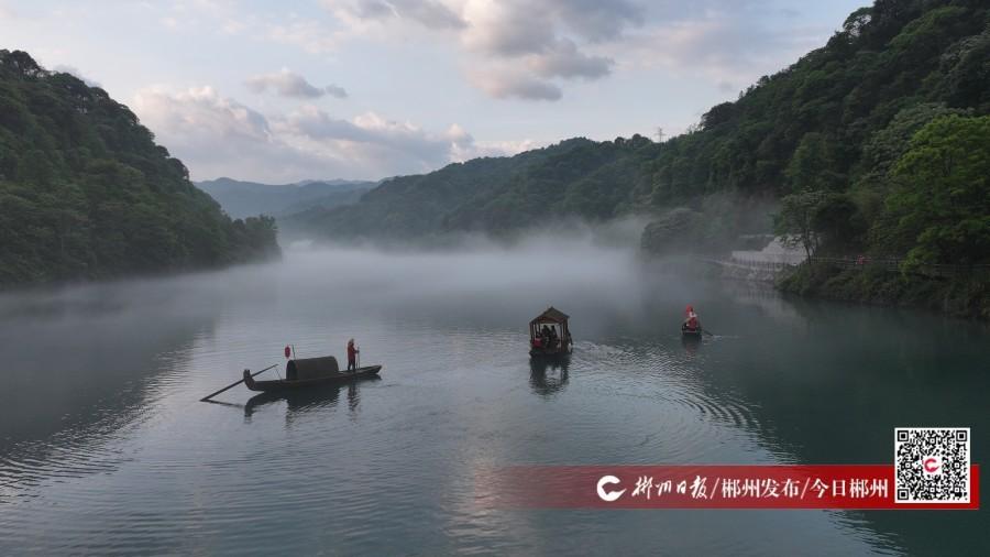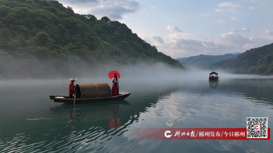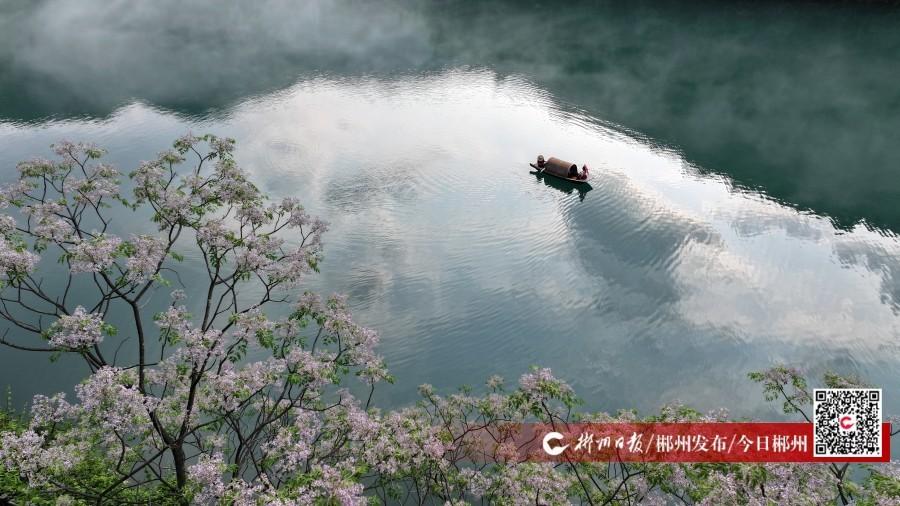 4月19日清晨,郴州資興市小東江薄霧縹緲,兩岸山花爛漫,水天一色,漁夫漁船與滿屏青綠相映成趣。