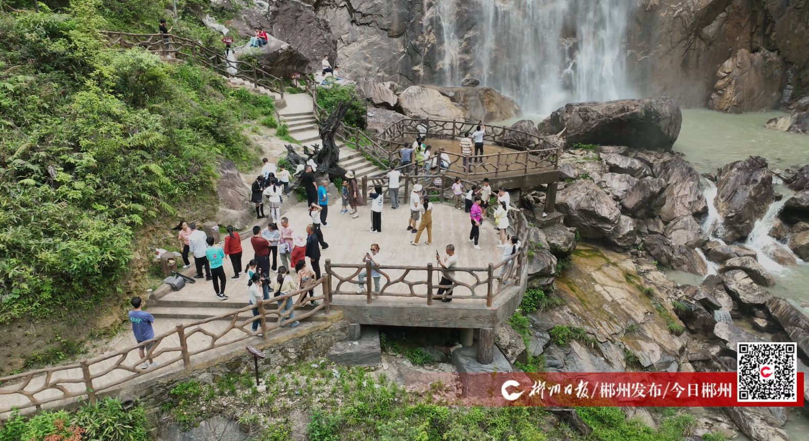 ▲龍溪瀑布景區(qū)的游客們近距離體驗(yàn)溪流的壯麗景觀。(鐘鳳侶 攝)