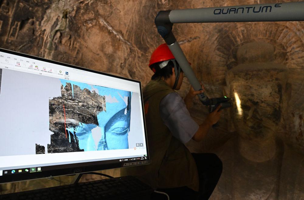 2025年4月9日,武漢大學文化遺產(chǎn)智能計算實驗室團隊成員在魏字洞使用關節(jié)臂掃描儀對佛像進行數(shù)字化掃描。圖片來源新華社