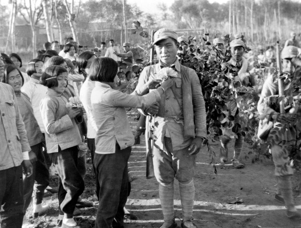 ▲這是老百姓為百團大戰(zhàn)勝利歸來的英雄佩戴光榮花(中國照片檔案館館藏)。