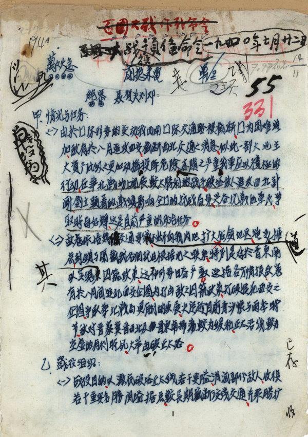▲為粉碎侵華日軍的“囚籠政策”、遏制國民黨頑固派的妥協(xié)投降逆流,1940年8月至翌年1月,中國共產(chǎn)黨領(lǐng)導(dǎo)的八路軍在華北發(fā)動了百團大戰(zhàn)。百團大戰(zhàn)第一階段以破襲正太鐵路為重點,這是1940年7月22日簽發(fā)的破襲正太路戰(zhàn)役預(yù)備命令(中央檔案館提供)。