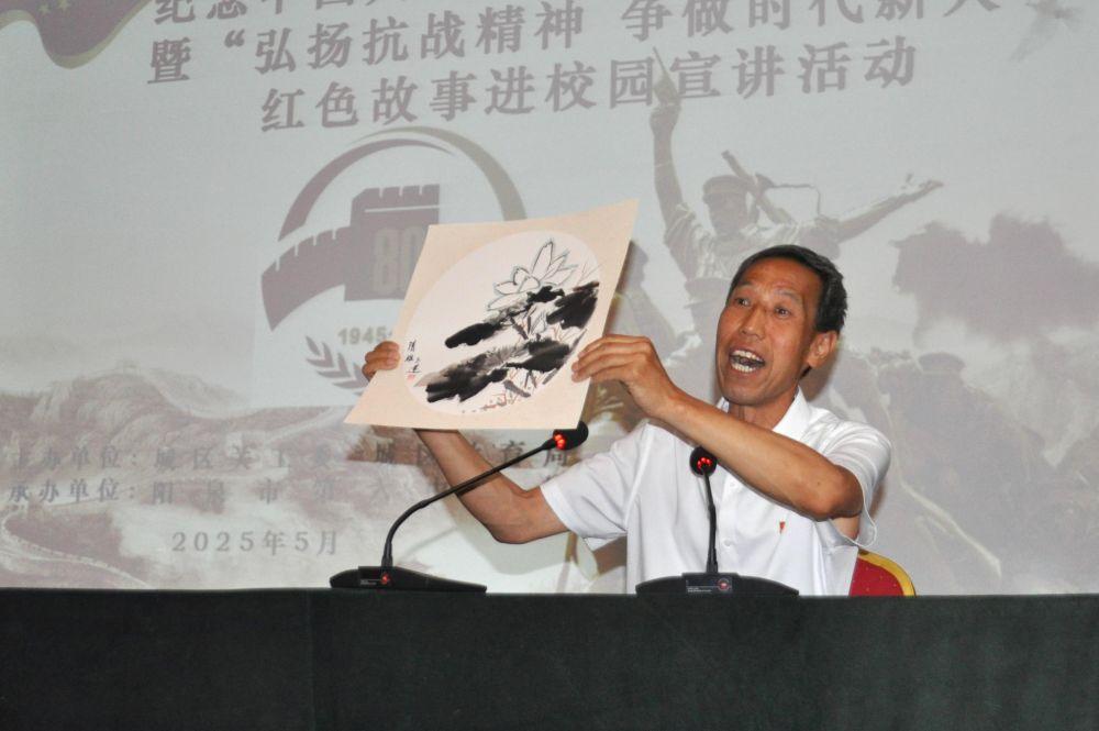 ▲出生在陽泉市正太鐵路破襲戰(zhàn)沿線區(qū)域的姚永田,從小聽抗戰(zhàn)故事長大。他利用課余時間研究家鄉(xiāng)抗戰(zhàn)史、編寫校本教材,并在校園義務(wù)宣講紅色故事100余場,努力讓紅色精神在年輕一代心中生根發(fā)芽。這是2025年5月26日,姚永田在陽泉市第六中學(xué)為學(xué)生們宣講。