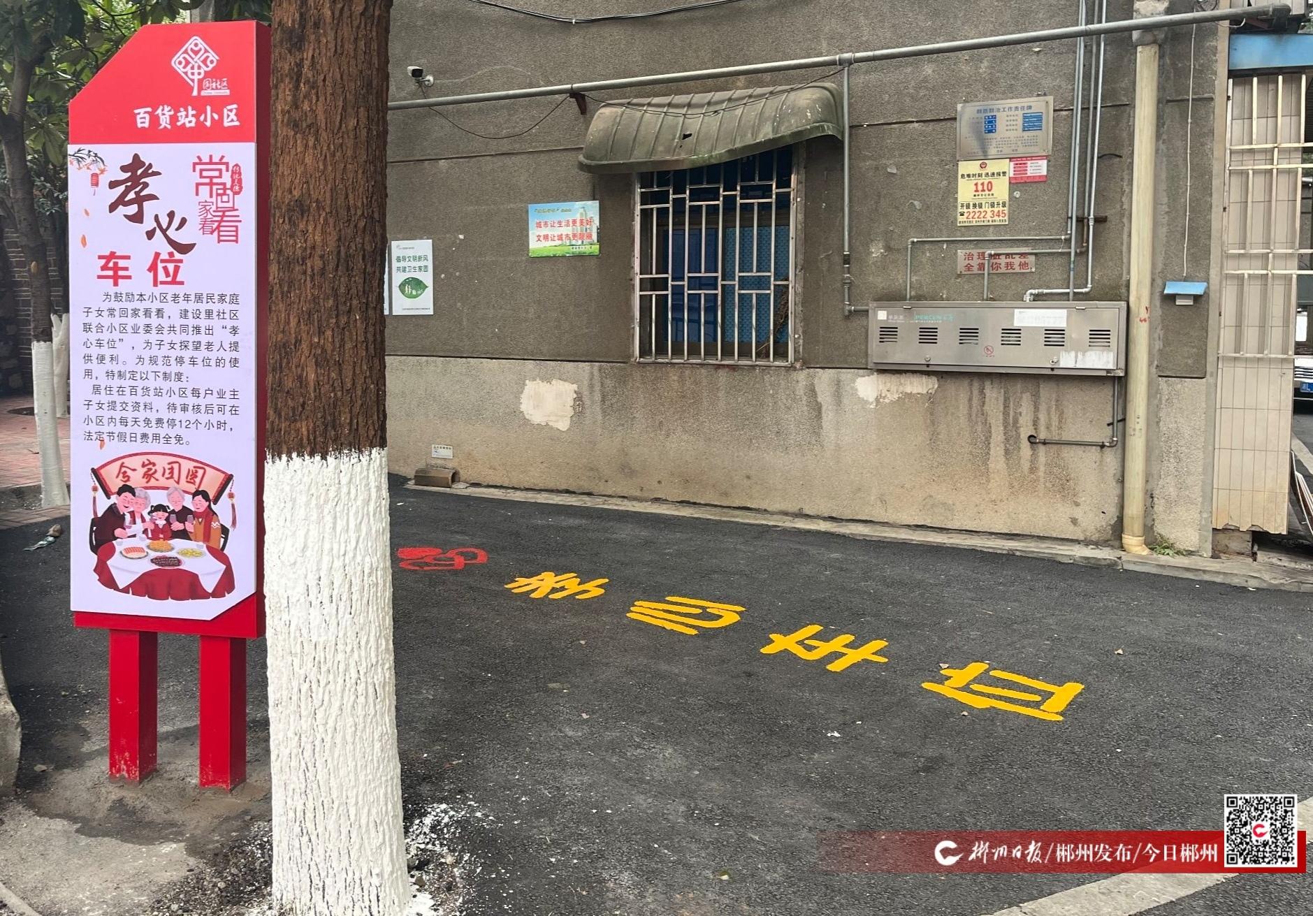 沿著緩坡走進(jìn)小區(qū),桂花樹與樟樹交織的綠蔭下,一排標(biāo)著“孝心車位”的黃線格外醒目。