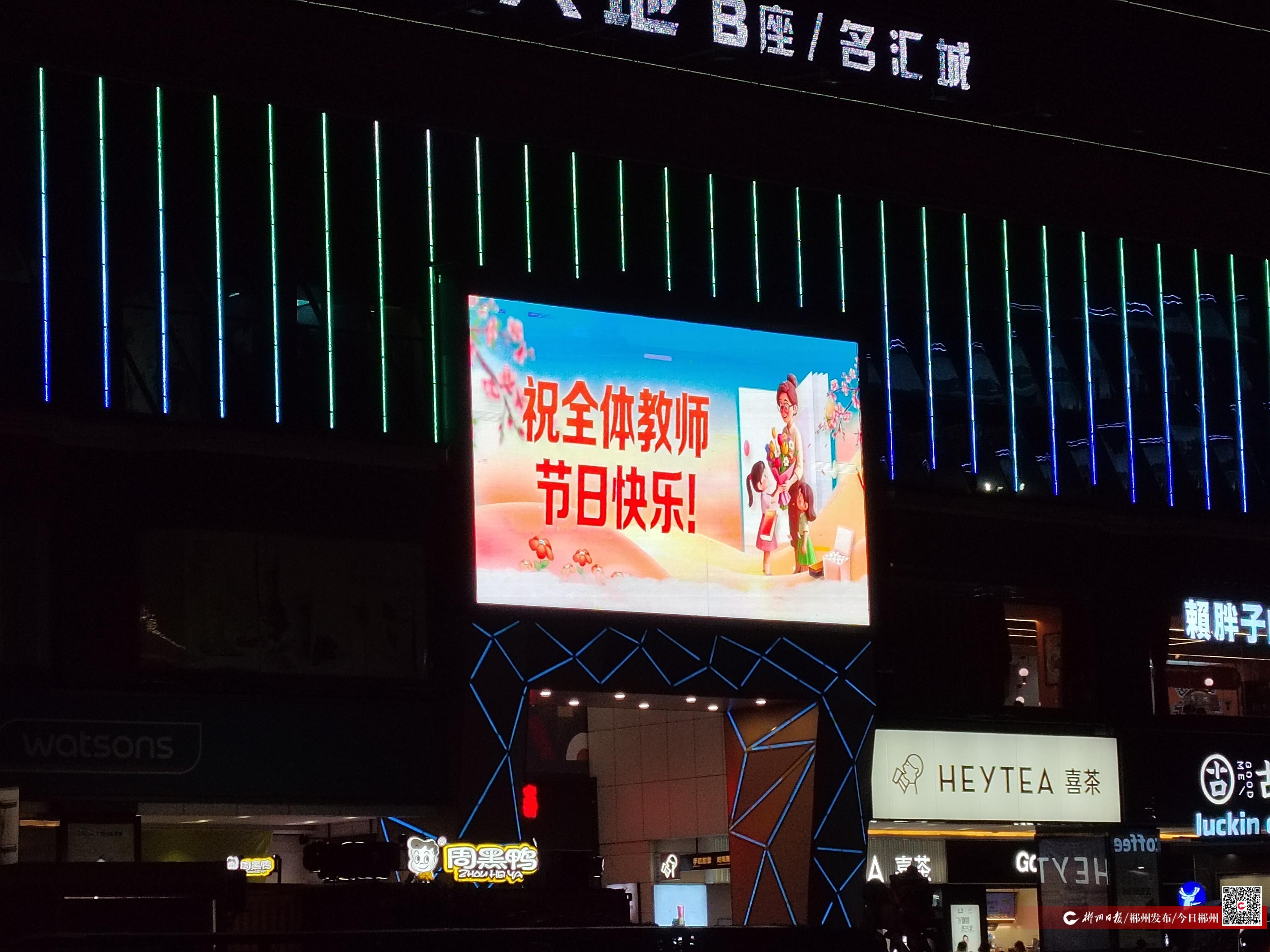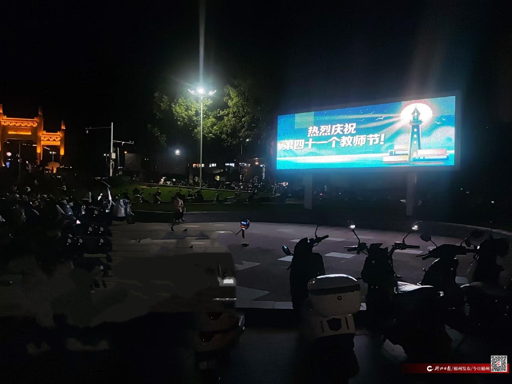 9月10日晚,為慶祝第41個教師節(jié),我市五嶺廣場、蘇仙福地廣場等多處地標建筑的電子顯示大屏同時點亮,以開展“為教師亮燈”公益活動的方式,向全市教師致以崇高的敬意和節(jié)日的祝福。