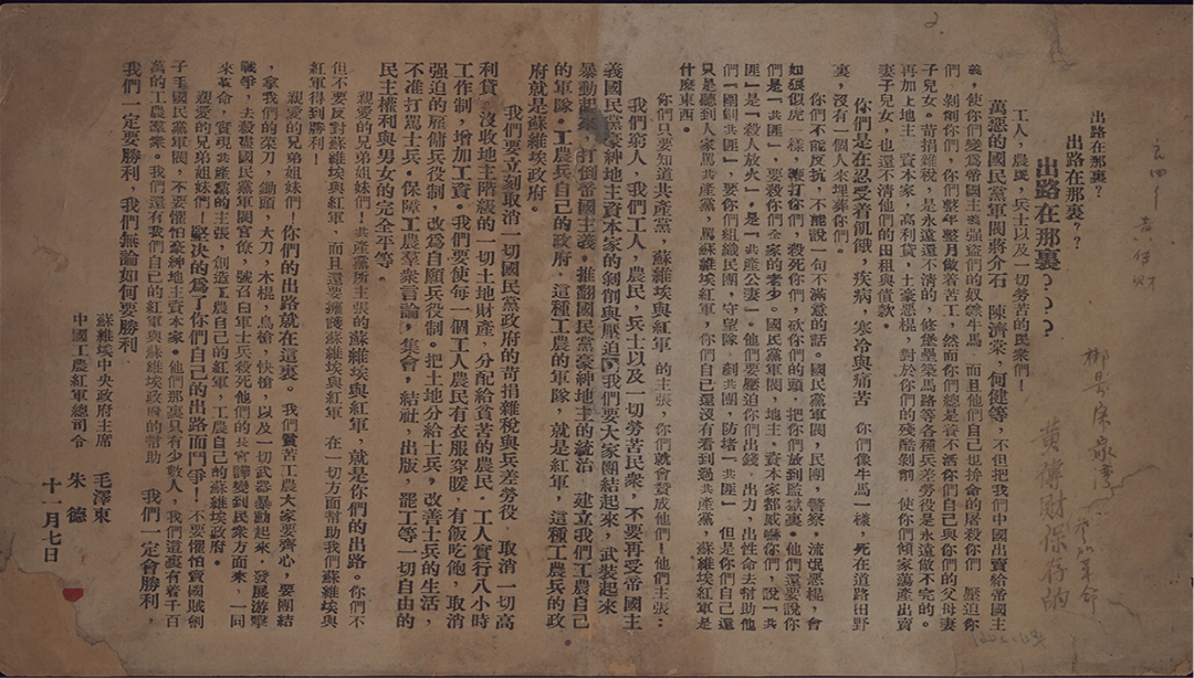 1934年10月,隨著第五次反“圍剿”失利,中央紅軍踏上戰(zhàn)略大轉(zhuǎn)移漫漫征途。國民黨反動(dòng)派置日寇侵略、民族危亡于不顧,對中央紅軍圍追堵截、窮追不舍,中國共產(chǎn)黨和中央紅軍到了危急關(guān)頭,中國革命到了危急關(guān)頭,“出路在哪里?”成為縈繞在所有紅軍戰(zhàn)士和窮苦百姓心頭的問題。1934年11月7日,毛澤東與朱德在汝城聯(lián)署發(fā)布《出路在哪里》文告,仿佛撥云見日、平地驚雷,旗幟鮮明地宣示“共產(chǎn)黨所主張的蘇維埃與紅軍,就是你們的出路!”文告結(jié)尾處“我們一定會(huì)勝利,我們一定要?jiǎng)倮?,我們無論如何要?jiǎng)倮?,三個(gè)鏗鏘有力的“勝利”,振聾發(fā)聵、直抵人心。這是一份宣言書,更是一個(gè)動(dòng)員令、一盞指明燈,既鼓舞了艱難時(shí)期的紅軍士氣,又給予了沿途百姓極大的革命信心。