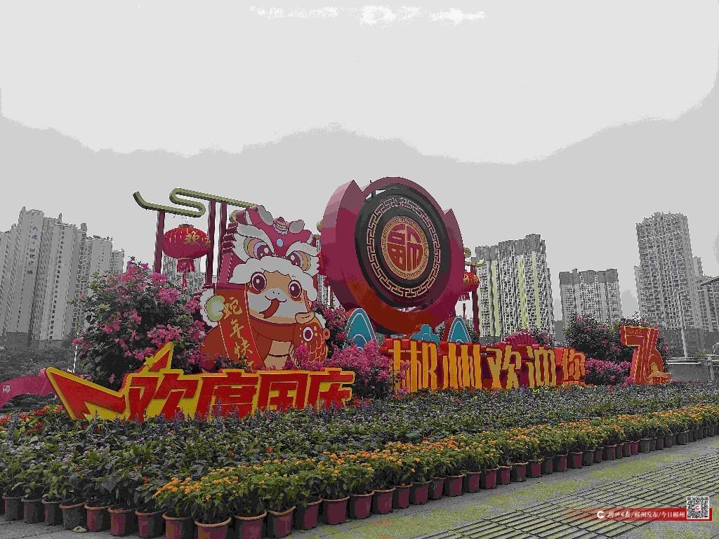 在郴州西站,城市道路綠化隊以“歡度國慶”和“郴州歡迎您”為主題,用鮮艷的紅色和黃色立體字表達(dá)了對祖國的熱愛和對游客的熱烈歡迎?;▔醒耄粋€巨大的“?!弊盅b飾,寓意著對祖國和人民的美好祝福。