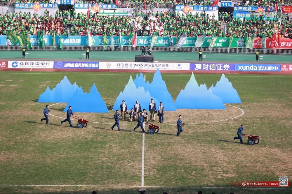 晴光灑落綠茵,熱土涌動激情。12月6日下午,“湘超”郴州隊(duì)與衡陽隊(duì)的對決一觸即發(fā),整個賽場早已被灼熱的氣氛籠罩。文藝與體育在此碰撞,地域精神與競技內(nèi)核在此交融,一場兼具視覺震撼與精神感召的暖場盛宴,將賽前氛圍推向高潮。