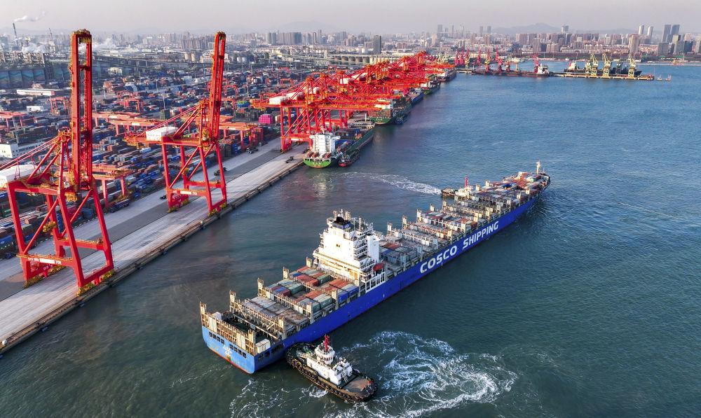 2025年12月5日,在山東港口日照港集裝箱碼頭,滿載集裝箱的船舶駛離港口(無人機(jī)照片)。新華社發(fā)(李大偉攝)