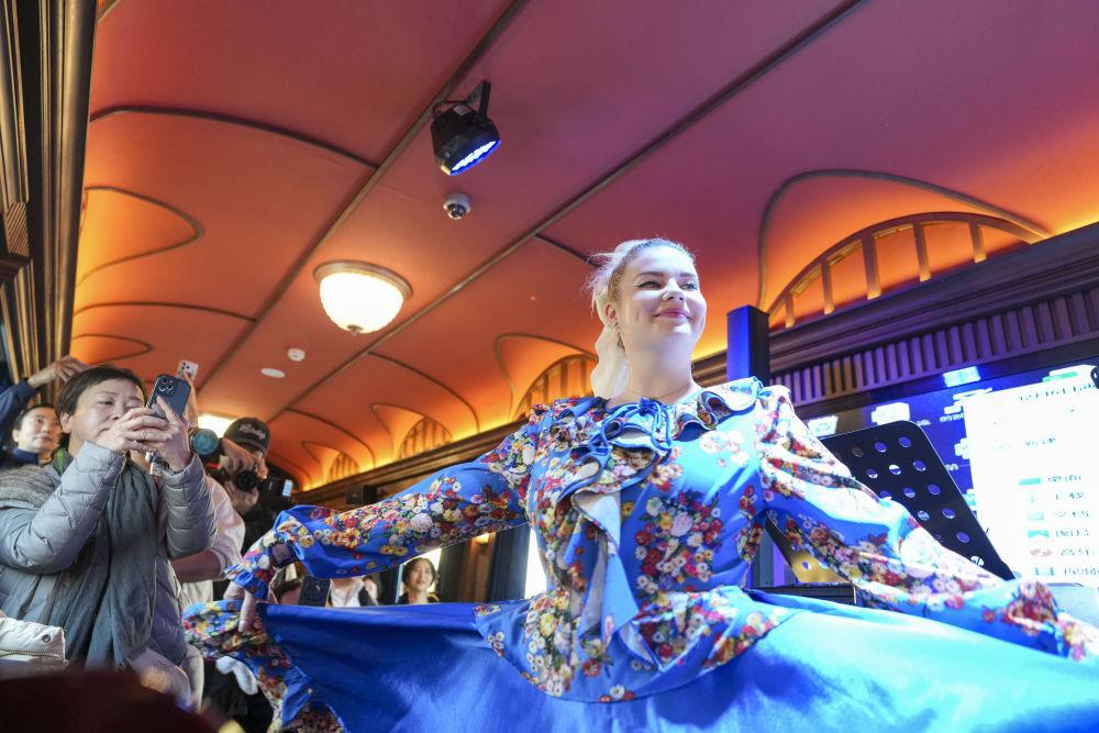 2025年12月6日,演員在黑龍江省“伊春號”旅游專列車廂中表演。當日,“伊春號”旅游專列投入試運行,40余名受邀體驗的游客乘專列由哈爾濱站出發(fā),去往亞布力滑雪旅游度假區(qū)。2025年以來,中國鐵路哈爾濱局集團有限公司陸續(xù)開行了多趟旅游列車,將特色體驗、民俗展示、定制化服務(wù)等進行融合,滿足游客需求,服務(wù)旅客出行。