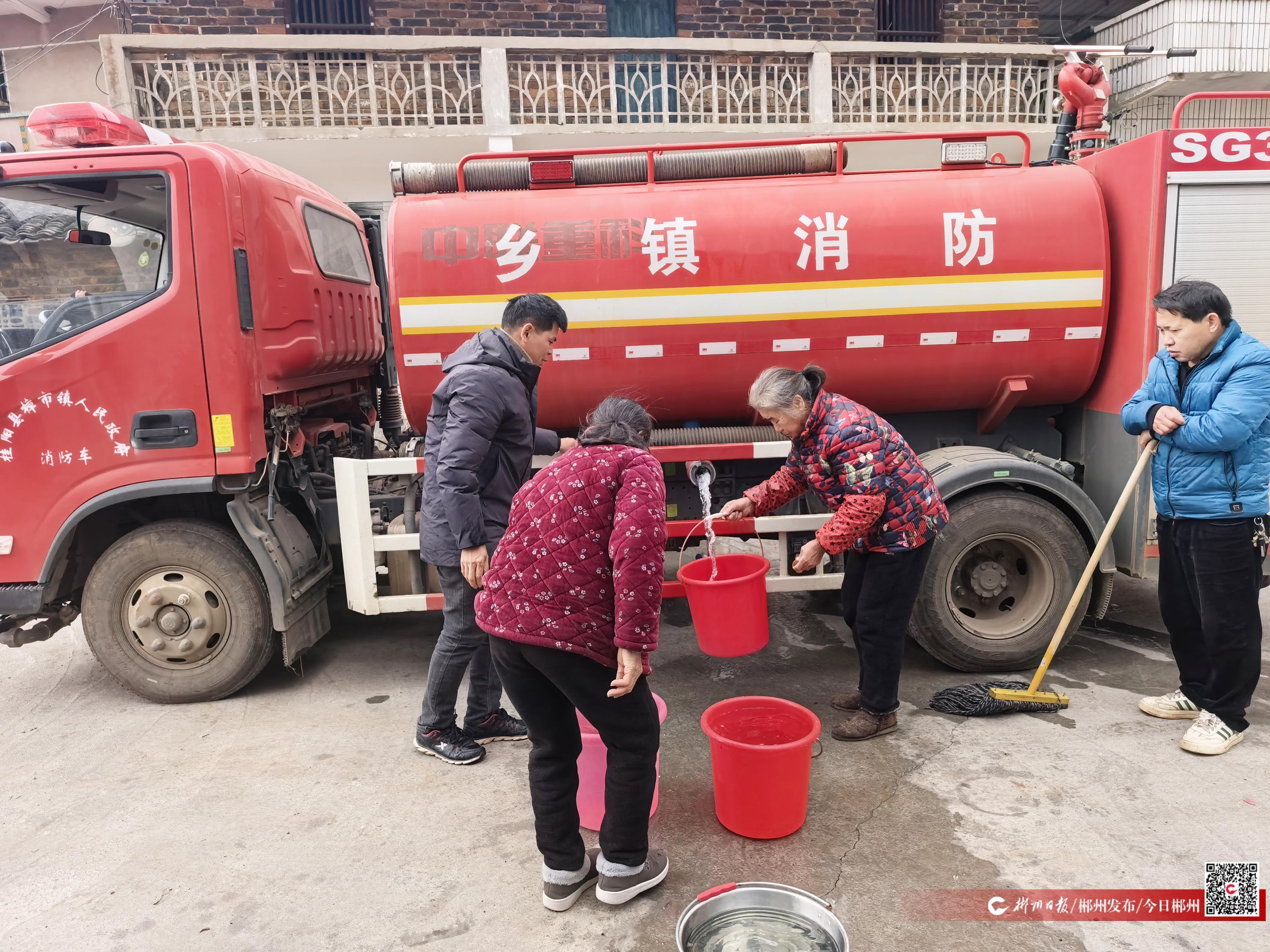 1月23日,桂陽縣樟市鎮(zhèn)梅塘村,一輛滿載清水的消防車在覆冰的村道上緩慢前行,將生活用水精準(zhǔn)送到村民家門口,及時解決了群眾的用水難題。