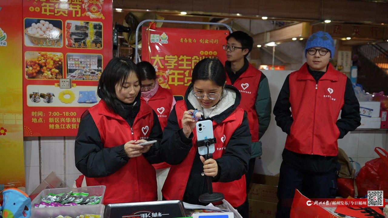 連日來,在資興市兩大農(nóng)貿(mào)市場的年貨節(jié)現(xiàn)場,處處可見返鄉(xiāng)大學(xué)生穿梭忙碌、朝氣蓬勃的身影,成為年貨節(jié)上一道亮麗的青春風(fēng)景線。他們熟練地架起補光燈、對準擺滿特產(chǎn)的展臺,化身元氣滿滿的助農(nóng)主播,將課堂上學(xué)到的市場營銷、視覺設(shè)計、數(shù)據(jù)分析等知識靈活運用于實踐。鏡頭前,有人手持臘肉展示肥瘦相間的紋理,有人舉起糍粑演示軟糯吃法,還有人生動講解東江福魚、東鄉(xiāng)土臘肉、糍粑等本地特色農(nóng)產(chǎn)品的由來與風(fēng)味,讓以往“藏在深山人未識”的家鄉(xiāng)特產(chǎn)通過直播成為網(wǎng)紅爆款。線上訂單一路攀升,不少特產(chǎn)剛上架就被搶購一空。