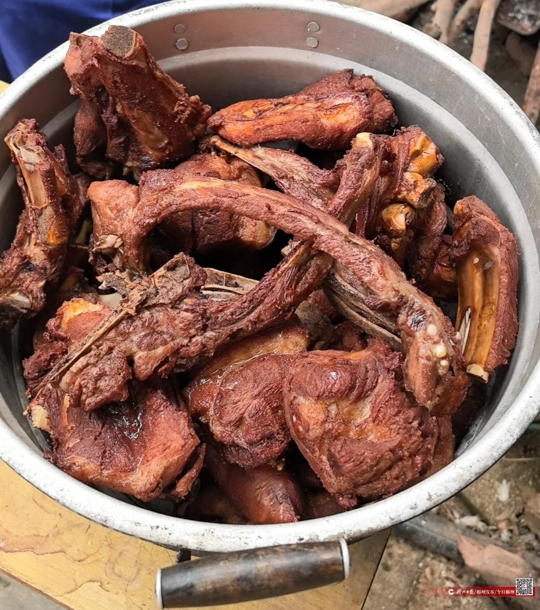 灶膛里柴火噼啪作響,大鐵鍋燒得滾燙。兒子李四平接過肉塊,下鍋焯水去血沫,他介紹道,桂陽過年肉講究用料,要選本地土豬五花肉,先焯后蒸,再用茶油慢煸,做出來才能肥而不膩、油亮入味。隨著油溫升高,濃郁肉香漸漸彌漫整個小院,引得一旁玩耍的孫輩不時探頭張望。