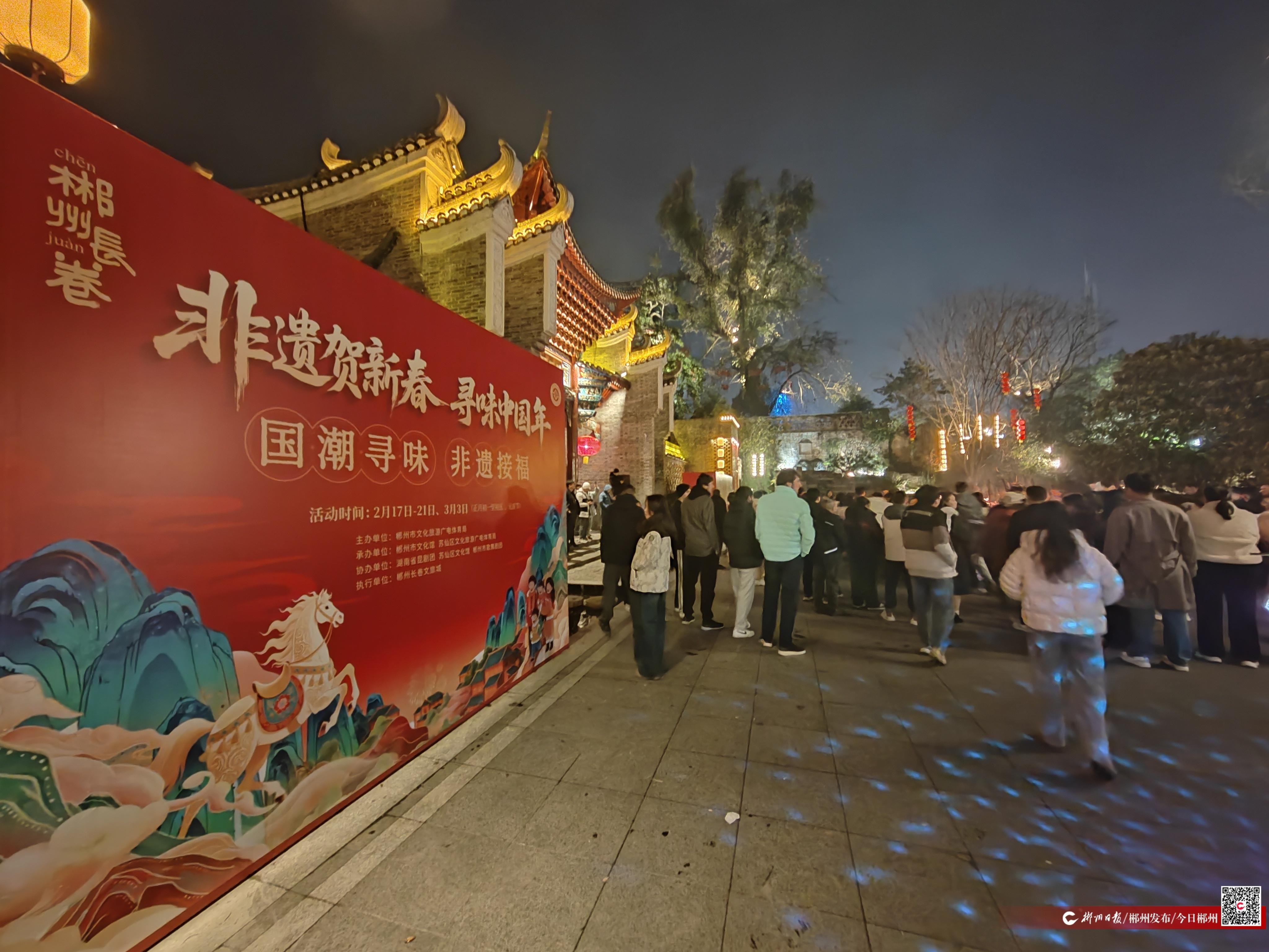 2月16日,年夜飯后,市民林女士牽著小兒子浩浩的手,跟著熱鬧的人潮往郴州長卷非遺街區(qū)走?!拔覀兘衲隂Q定帶著孩子來體驗一下跟家里不一樣的年味,說實話,大家都比往年更期待?!彼难劬铮M了期待。