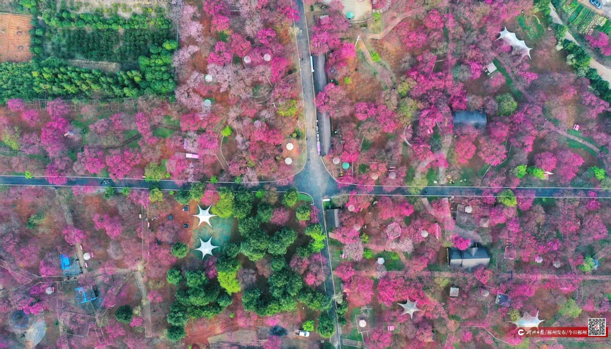 從高空俯瞰,櫻花盛開,如紅色的爛漫花海,蔚為壯觀。沿著林陰小道走進了漫山遍野的櫻花園,在這里,緋紅的花瓣層層疊疊、綴滿枝頭,微風輕拂間,花枝搖曳,簌簌落英鋪就夢幻花徑。