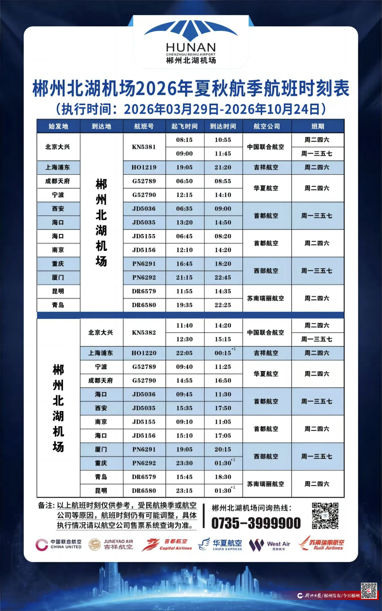 春暖花開,航線煥新!郴州北湖機(jī)場迎來了2026年全國民航夏秋換季的重要時刻。2026年3月29日至2026年10月24日,機(jī)場開始執(zhí)行全國民航夏秋航季航班計(jì)劃,共計(jì)210天,出行體驗(yàn)全面升級。