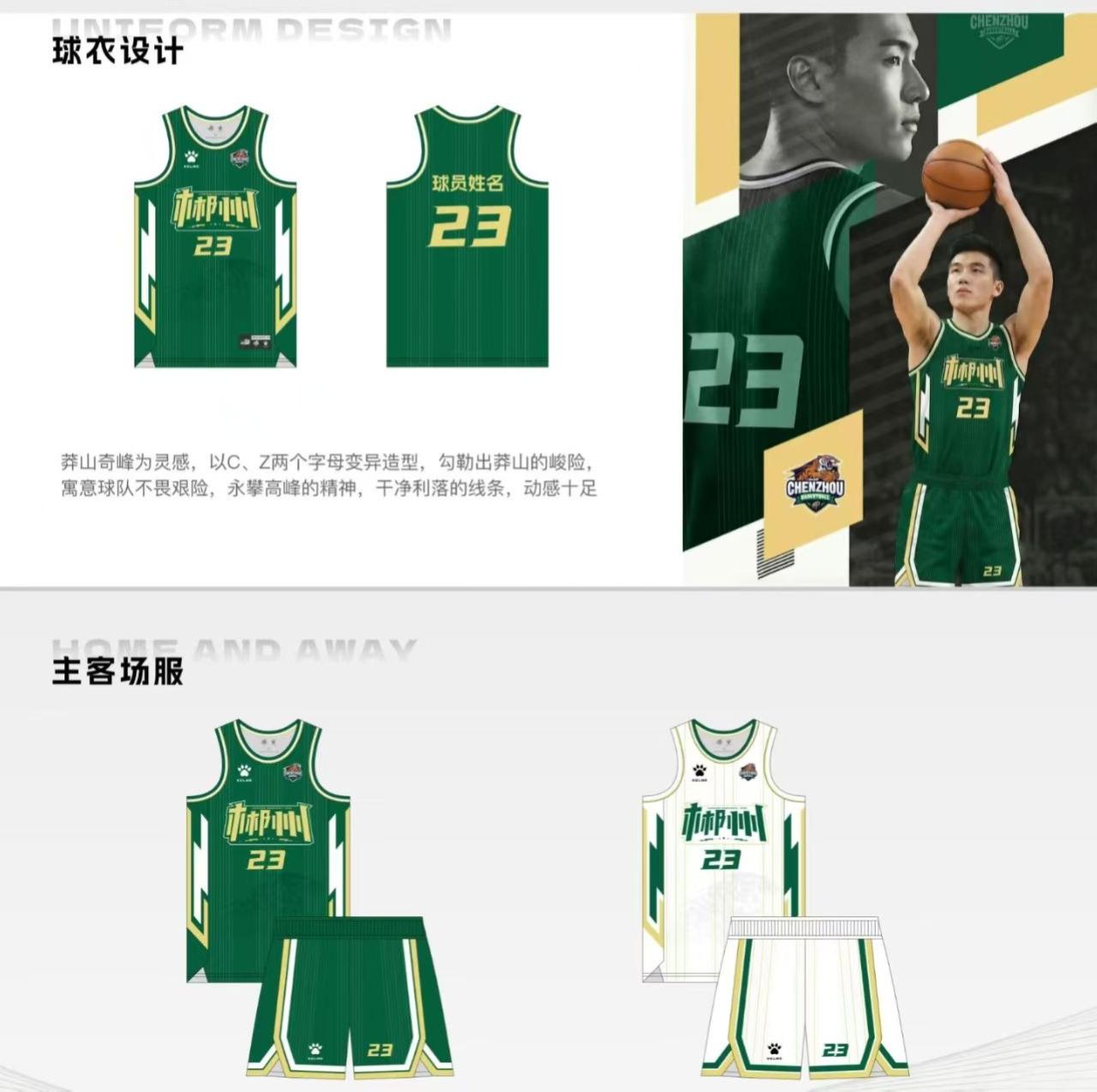 郴州隊(duì)隊(duì)服:以綠色為主色呼應(yīng)生態(tài)之城,搭配虎紋圖案,取“林中之城,虎虎生威”之意。