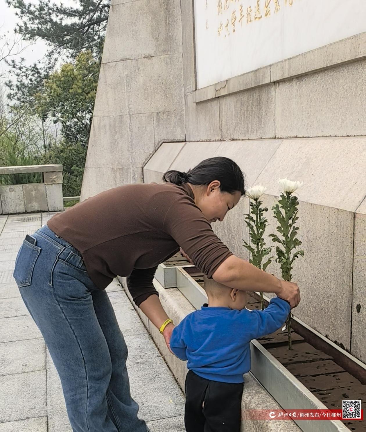 湘南起義紀(jì)念塔前,參加活動(dòng)的人員正在陸續(xù)列隊(duì)。這時(shí),一個(gè)小小的身影格外引人注意——一位年輕媽媽牽著一個(gè)剛學(xué)會(huì)走路的小男孩,緩緩走向紀(jì)念塔。孩子手里攥著一朵白菊,小手攥得緊緊的,花瓣微微顫動(dòng)。媽媽手里也拿著一朵,另一只手穩(wěn)穩(wěn)地護(hù)著孩子。